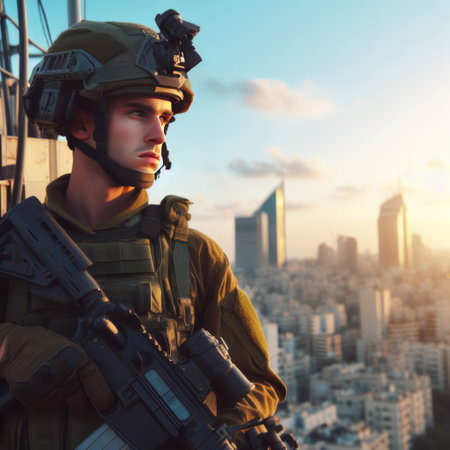 Israeli soldier in full gear with a blurred city skyline in the background