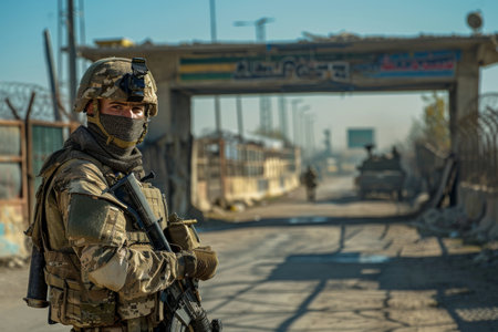 A soldier standing guard at a checkpoint --ar 3:2 Job ID: 1e2b1b72-c5d8-4c08-a4f4-575022e2bf87