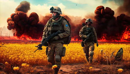 Soldier on the battlefield against the background of fire and smoke, war in Ukraine, Generative AI content
