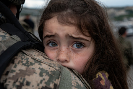A scared young girl being comforted by a soldier.