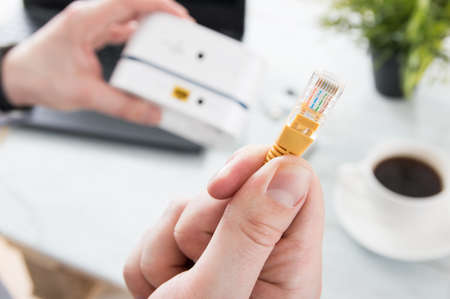 Businessman holds LAN cable over desk with laptop and mobile WiFi router
