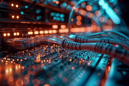 Close-up view of network cables connected to switches with glowing led indicators, symbolizing data transfer, connectivity, and technology in a modern data center environment. Generative AI