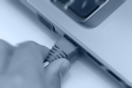 motion blur background of hand connecting lan port to laptop computer