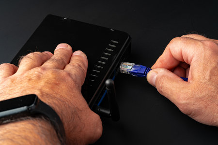 Mans hand plugging internet cable into wifi router