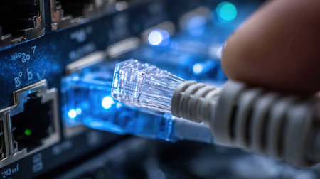 Cables plugged into a network switch router, with LED lights flashing to indicate high-speed, reliable connectivity in a data center.