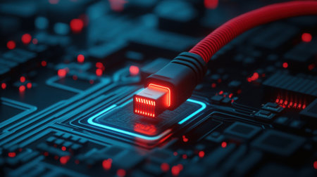 An artistic close-up of a network cable plugged into a circuit board, illuminated by red LEDs, representing the fusion of technology and innovation in modern electronics.