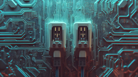 Detailed image featuring USB connectors set against a vibrant circuit board, illustrating the advancement of technology and connectivity in the modern digital landscape.