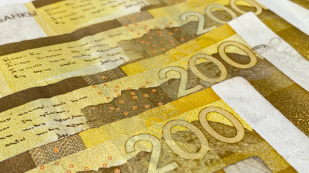 Cash banknotes of two hundred som. A close-up of a part of the yellow 200 som notes, the current money of Kyrgyzstan. Kyrgyz national currency. Financial business background concept.