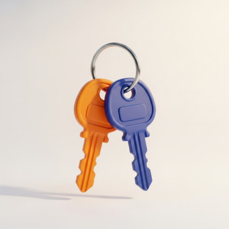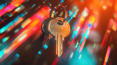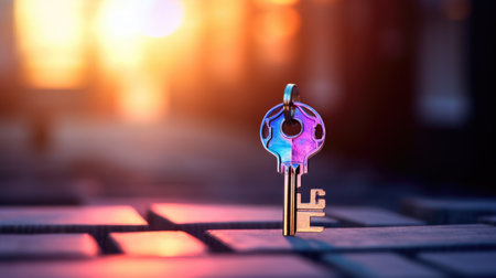 A single key dangles from a ring, showing its colorful design. The backdrop features a beautiful blur of colors, creating a dreamy atmosphere.