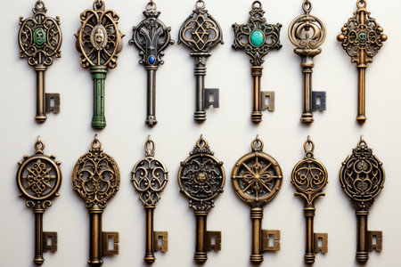 A collection of vintage keys placed on a table. This image can be used to represent concepts such as antique, nostalgia, security, or unlocking mysteries.
