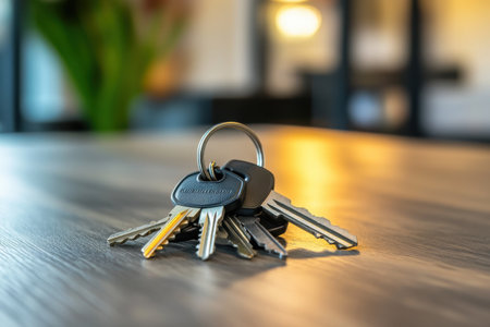 A vibrant assortment of keys on a sleek wooden surface, emphasizing organization and security in everyday life. Perfect for themes of security and efficiency.