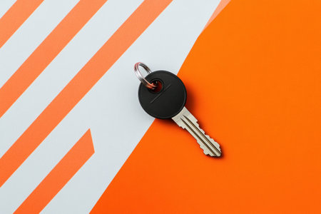 Close up of a single black key on an orange and white backdrop, highlighting minimalism and modern design, perfect for illustrating security and accessibility concepts