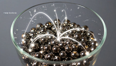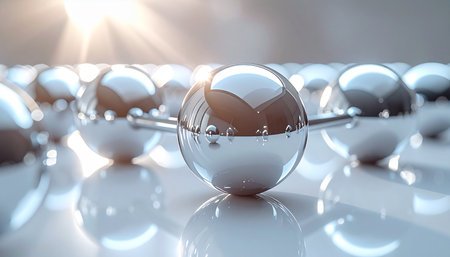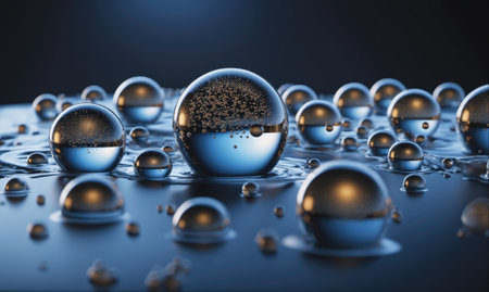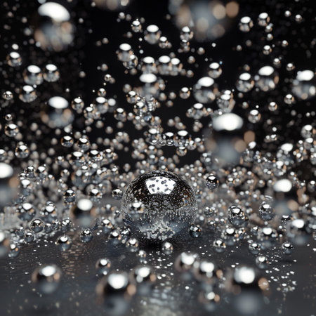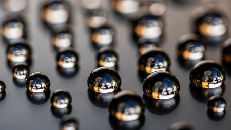 Close-up of spherical water droplets on a reflective surface, creating an abstract and mesmerizing liquid texture. The light reflecting off the spheres creates a glossy and shimmering effect.
