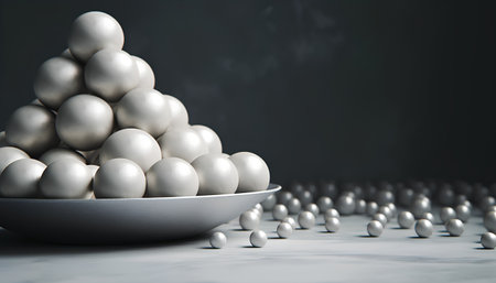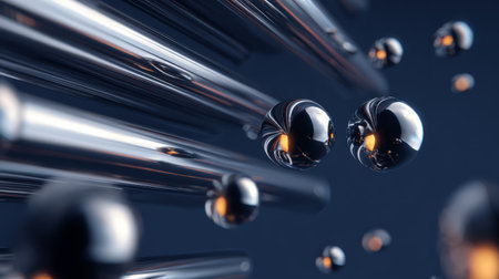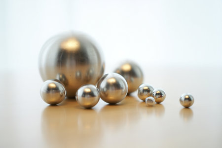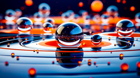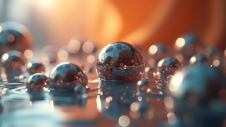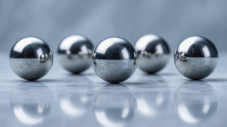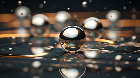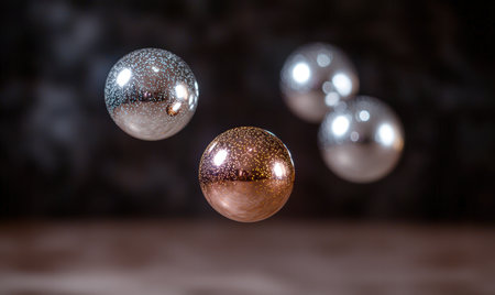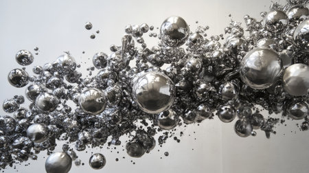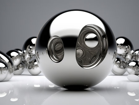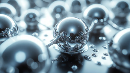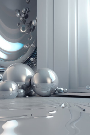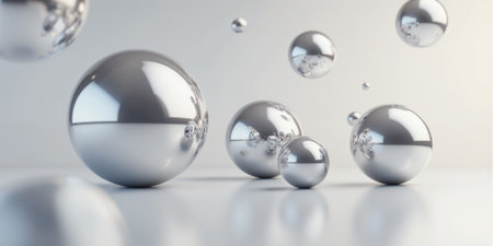Multiple shiny metallic spheres hover above a smooth surface, reflecting light and creating a mesmerizing visual effect. The arrangement offers a modern aesthetic, emphasizing textures and reflections.