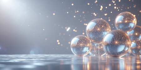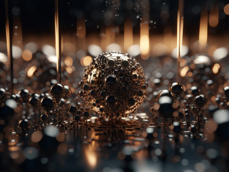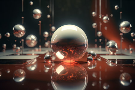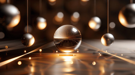 A captivating glass sphere surrounded by floating metallic balls, illuminated with warm light. This abstract composition showcases elegance and modern aesthetics, perfect for design.