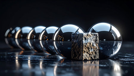 A captivating arrangement of reflective spheres resting on a textured surface, illuminated by soft ambient light that creates a modern and artistic atmosphere.