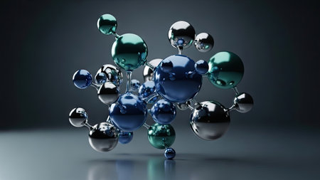 An abstract composition features a complex molecular structure composed of interconnected spheres. The glossy spheres display a combination of blue, green, and silver hues, reflecting ambient light. The image has a dark, gradient background, enhancing the three-dimensional appearance. Suitable for scientific visualizations and creative design applications.