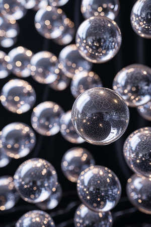 A cluster of transparent spheres with internal bubbles arranged on a black background.