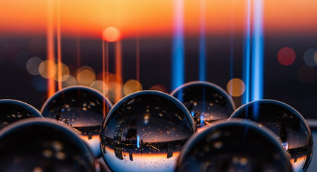abstract background with glass balls and colorful bokeh lights at sunset