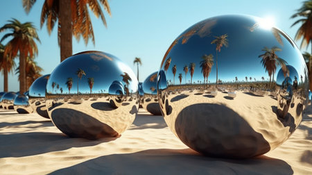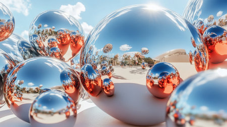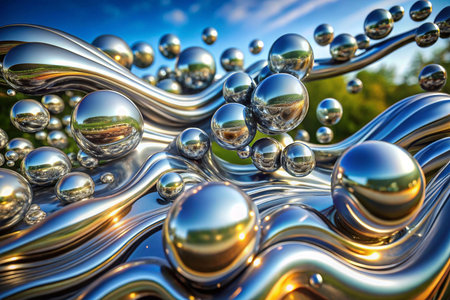 Abstract metal flow, reflective spheres, outdoor setting, sunlit ripples
