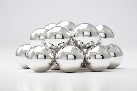 A cluster of shiny, reflective silver spheres is arranged in a geometric formation on a light gray studio background.