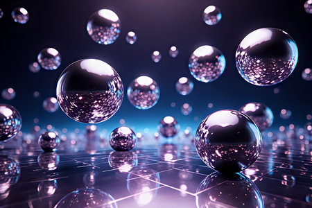 A captivating abstract image of countless shiny, metallic spheres floating in a dark space, illuminated by purple and blue reflections from below. The scene creates a mysterious, sci-fi atmosphere. Some spheres are up close, reflecting light with sparkling specks, while others in the distance are blurred. This image evokes a sense of unreality, modernity, and advanced technology.
