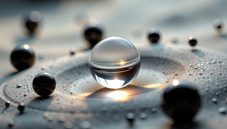 A transparent glass sphere with light reflection on textured surface surrounded by black spheres creating abstract harmony
