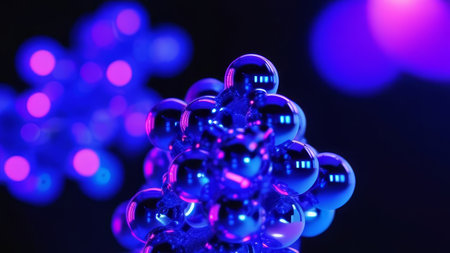 Round blue molecules in neon light, on dark background