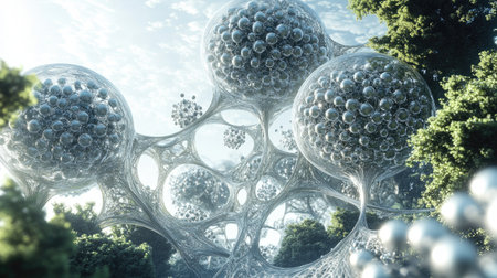 This captivating abstract image features futuristic spherical structures intertwined with organic forms set against a luminous sky, evoking a sense of innovation.