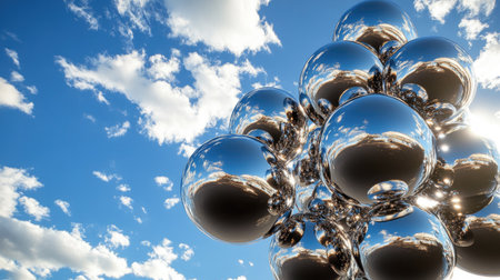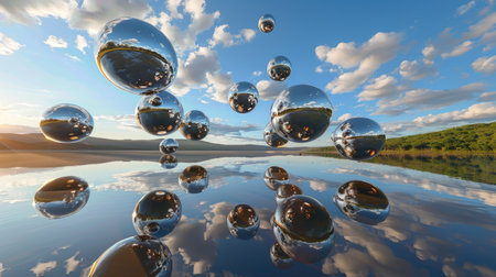 This captivating image showcases silver spheres gracefully floating above a serene water surface, reflecting the vibrant blue sky and fluffy clouds.