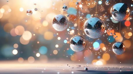 A mesmerizing display of shiny disco balls hanging in mid-air against a backdrop of dreamy bokeh lights. Perfect for capturing the essence of celebration.