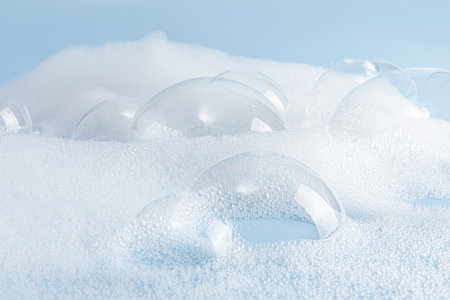 Large transparent soap bubble on the foam surface of detergent cosmetics, shampoo, soap, powder on a blue background. Front view. Close up of bubbles