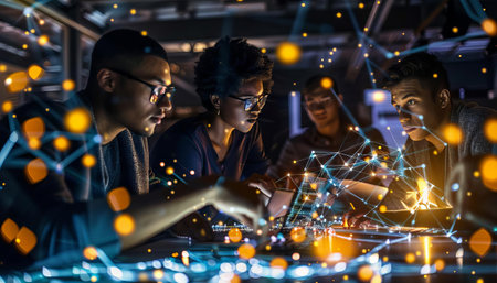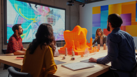 A diverse group of businesspeople collaborating in an open office environment, using a holographic interface to interact with 3D models of their project.