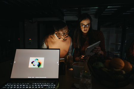 Surprised businessman and businesswoman looking into laptop display discuss career opportunities after mba graduation. Hologram flowchart.