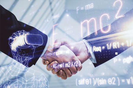 Double exposure of formulas drawings hologram and handshake of two men. Education concept