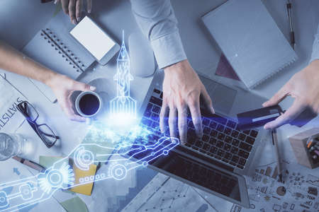 Double exposure of man and woman working together and creative hologram drawing. Computer background. Top View. Start up concept.
