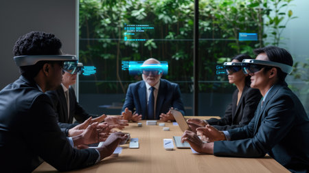 Collaborative Business Meeting with Virtual Reality Technology and Team Engaged in Strategic Planning and Digital Interaction at Modern Workplace.