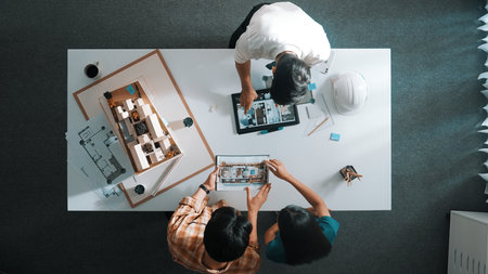 Top down aerial view of civil engineer team holding blueprint at meeting room. Aerial view of group of architect planning and discussing about global connection and data base communication. Symposium.