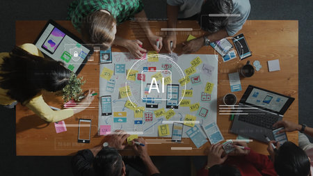A dynamic overhead view of a diverse team engaging in a collaborative brainstorming session focused on digital product development and innovative AI concepts. Raster