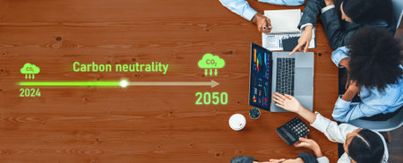 A diverse team of business professionals engaged in a discussion about carbon neutrality goals, showcasing a laptop with a timeline from 2024 to 2050 in a modern office setting.