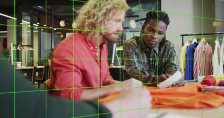 Image of data processing over diverse business people in office. Global business and digital interface concept digitally generated image.