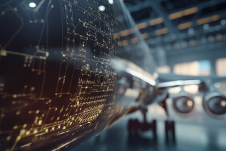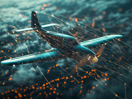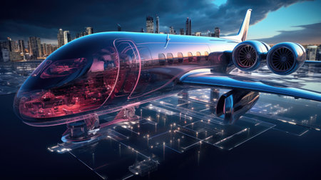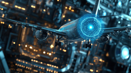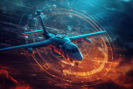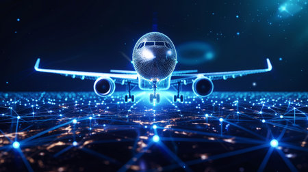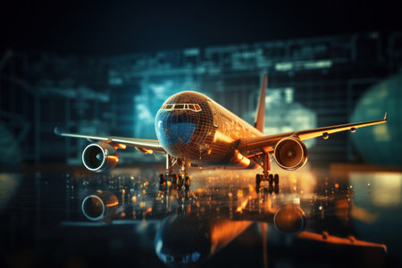 Aircraft against a futuristic holographic data network background in a stunning photography capture