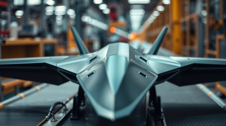 Close-up of a futuristic dark gray stealth drone with angular wings, positioned on a factory assembly line