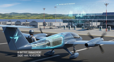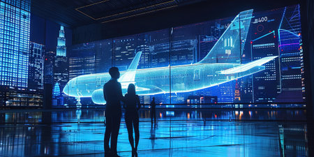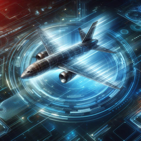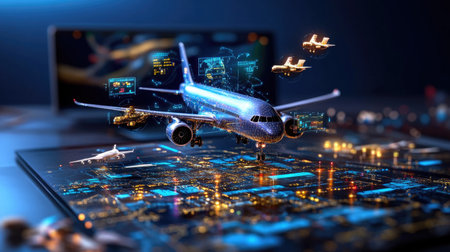 Conceptual illustration of an AI-driven aviation industry with advanced flight control systems