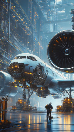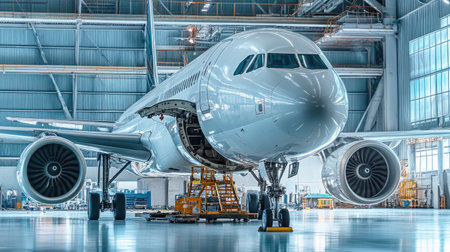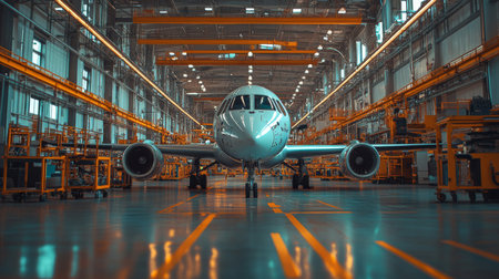 Modern Aircraft Assembly in a High Tech Facility Showcasing Advanced Engineering and Construction Processes With Distinct Infrastructure and Equipment Generative AI