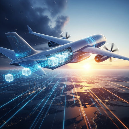 A futuristic cargo jet taking off, guided by glowing blue holographic flight signals in an AI-powered airspace