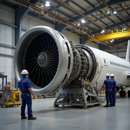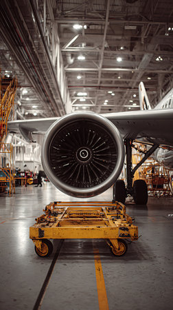 Inside a large aircraft hangar, a close-up focuses on an airplane engine undergoing inspection. A yellow tool cart sits below, highlighting the maintenance environment.