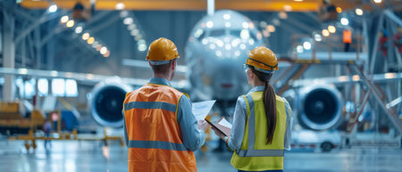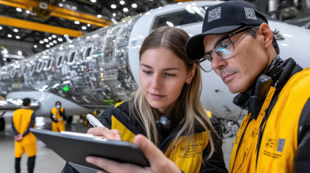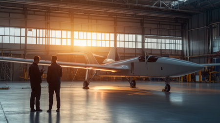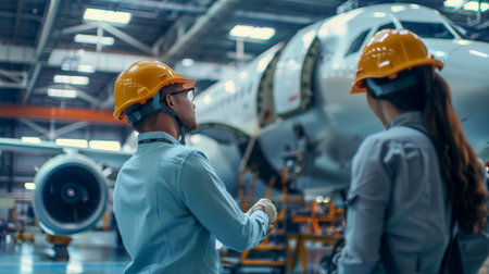 Two engineers discussing the new airplane model in the hangar