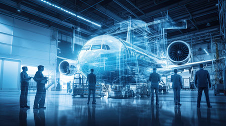 Engineers in a cutting-edge aerospace facility. Sky blue and technological background