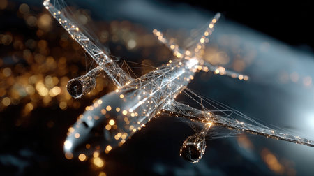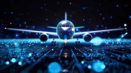 A striking representation of a futuristic airplane entwined with digital networks and glowing elements, highlighting innovation in air travel technology.